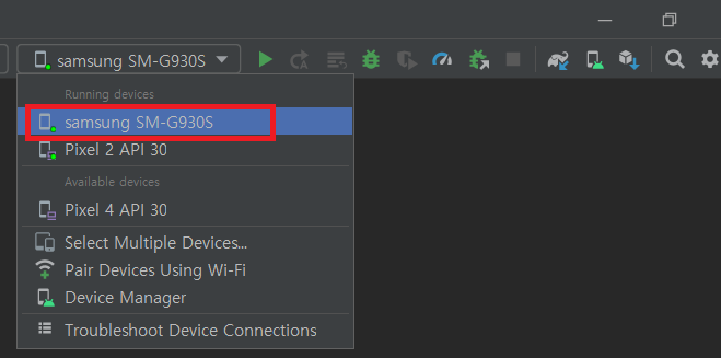 ˙ 단말기와 PC간 USB를 연결하고, 안드로이드 스튜디오에서 연결한 핸드폰이 나타나는 것을 확인한다.