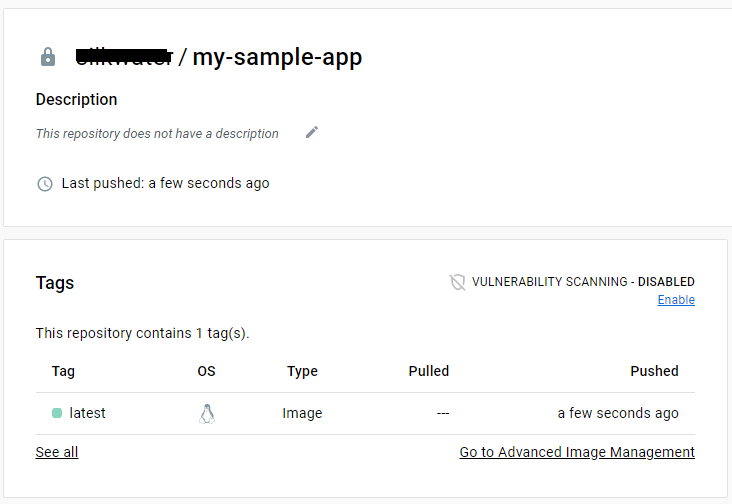 ˙ 도커허브 저장소에 이미지가 저장된 것을 확인한다.