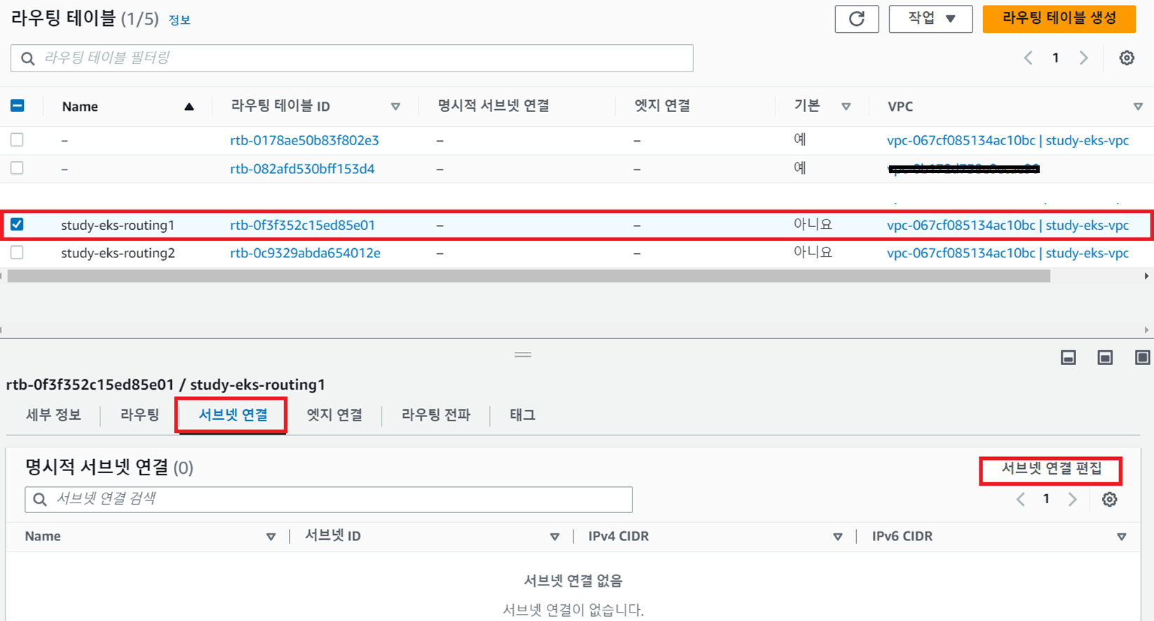 - study-eks-routing1과 study-eks-subnet1 간 연결