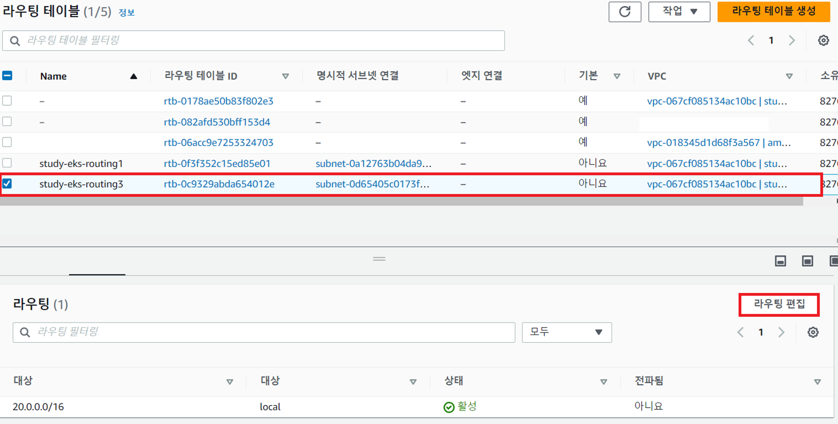 - study-eks-routing3과 study-eks-subnet3 간 연결