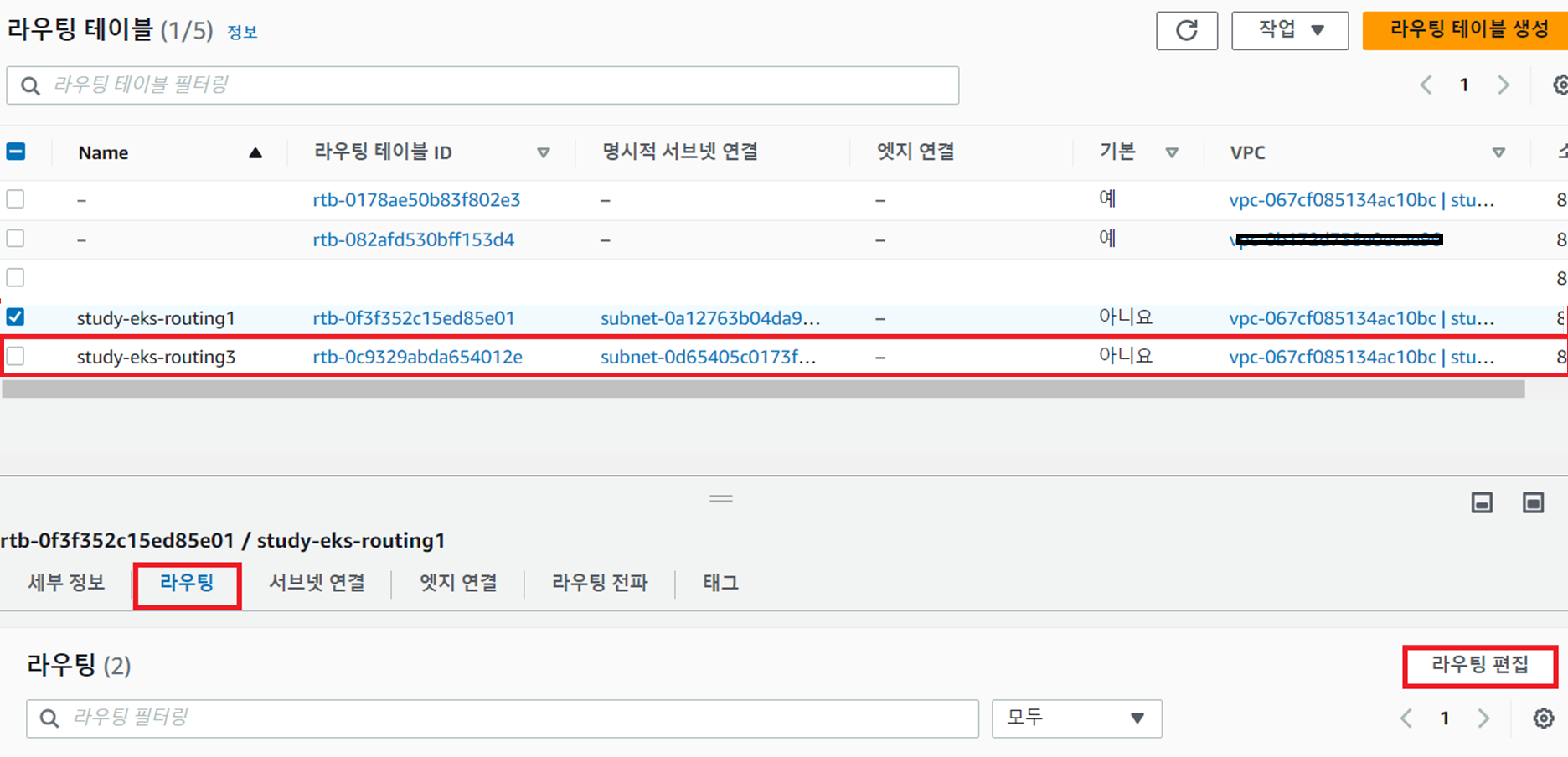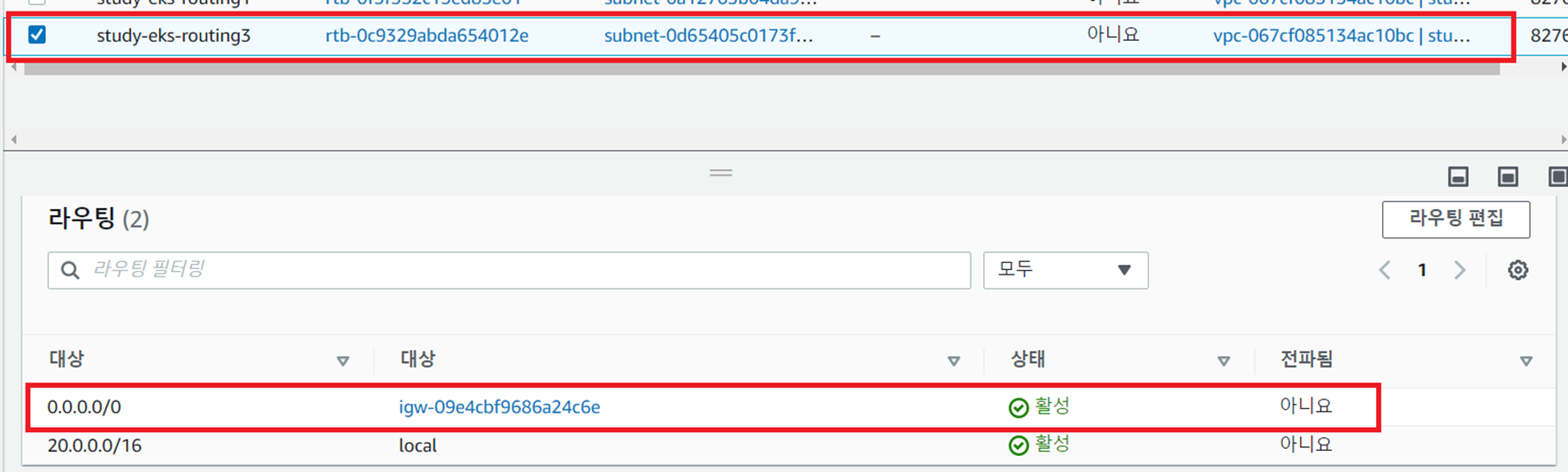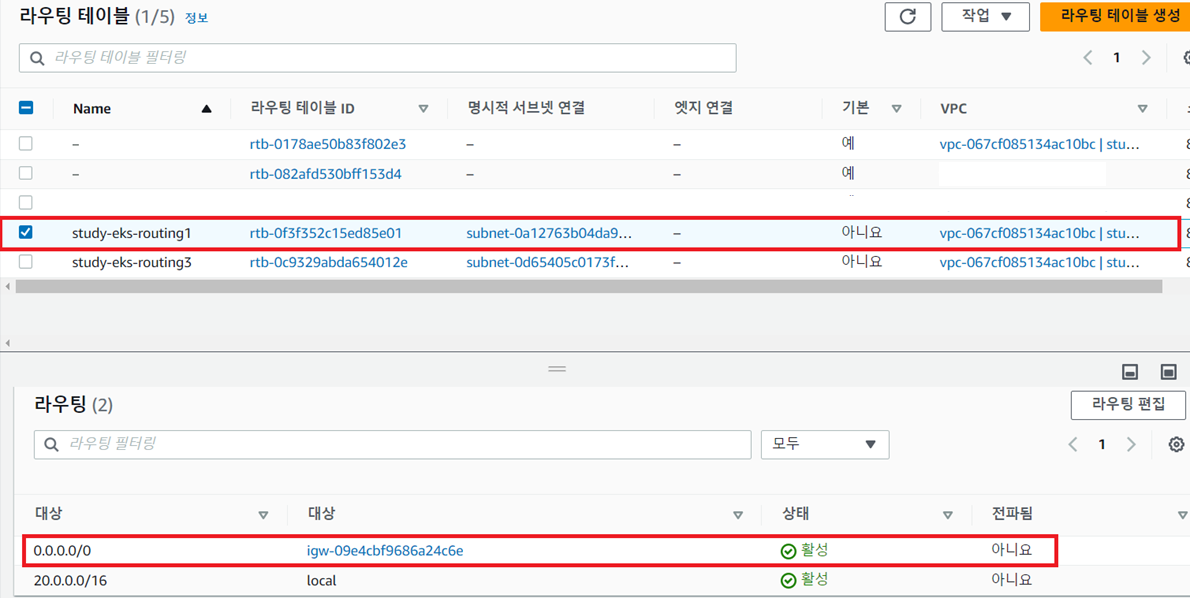 - study-eks-routing1과 IGW 간 연결