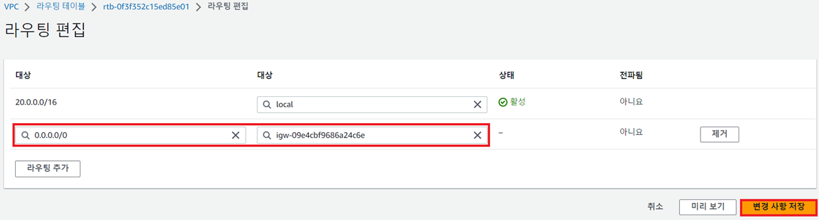 ⑥ 라우팅 테이블에 IGW를 연결하여 Public Subnet을 구성한다.