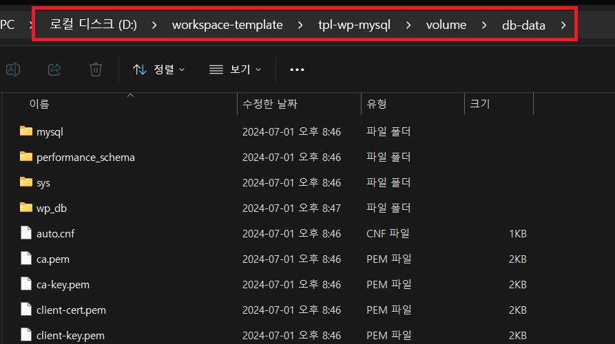 ˙ 설치한 워드프레스 및 연동 DB(MySQL)의 파일이 마운트된 로컬 드라이브에 정상적으로 저장되었는지 확인한다.