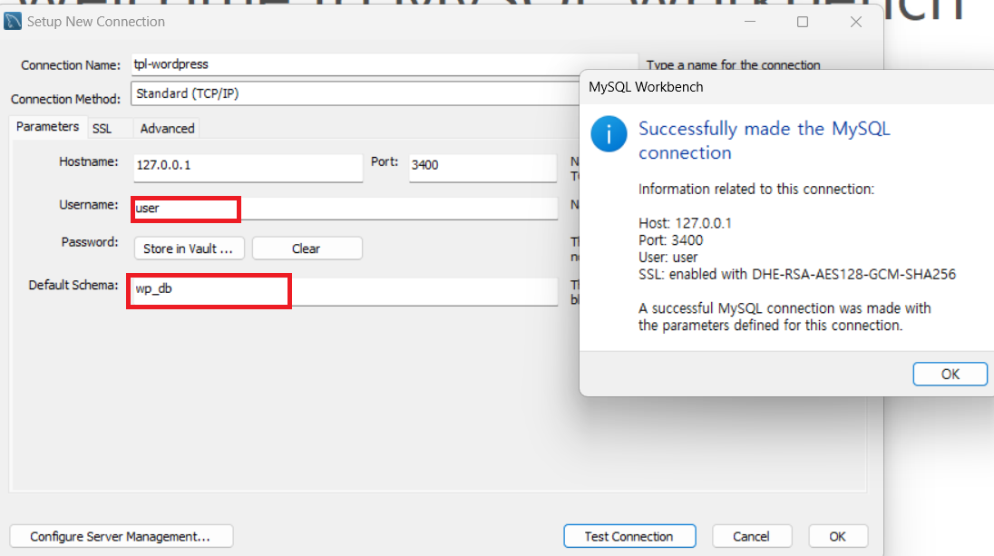 - 여기서는 MySQL는 3400 포트로 접속하고, wordpress는 8090 포트로 접속하도록 설정 하였다.
