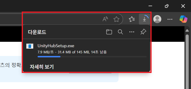 ④ 브라우저 오른쪽 위에 UnityHubSetup.exe가 다운로드 되는 것을 확인할 수 있다.