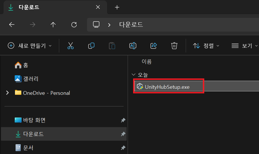 ⑤ 다운로드 폴더에서 UnityHubSetup.exe를 더블 클릭하여 실행한다.