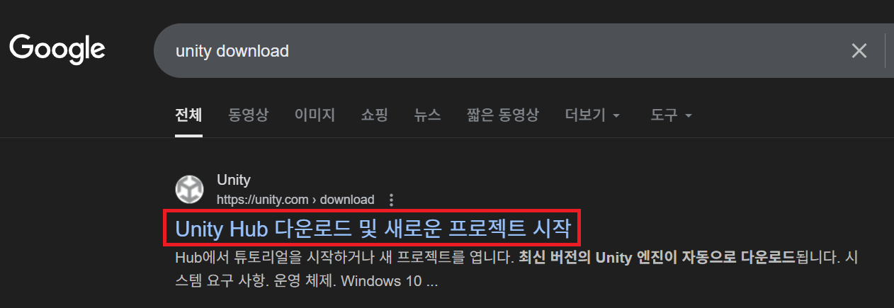 ② 검색 결과에서 Unity Hub 다운로드 및 새로운 프로젝트 시작 - 공식 Unity 사이트 항목을 클릭한다.