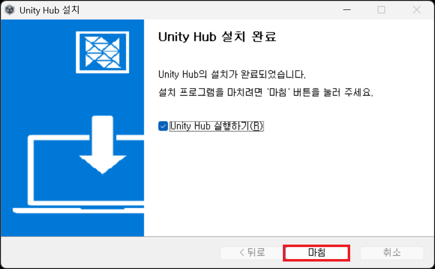 ⑨ 설치 완료 화면이 보이면 Unity Hub 실행하기 체크를 유지한 상태로 마침을 누르면 바로 Unity Hub가 실행된다.