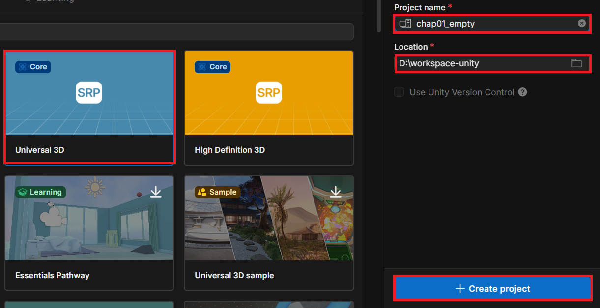 ② 프로젝트 템플릿, 프로젝트 이름, 경로를 입력하고 "Create project" 버튼을 클릭한다.
