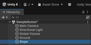 ④ "Hierarchy 창" → "마우스 우클릭 팝업메뉴" → "3D Object" → "Cube"를 생성하여 경사로를 만든다.