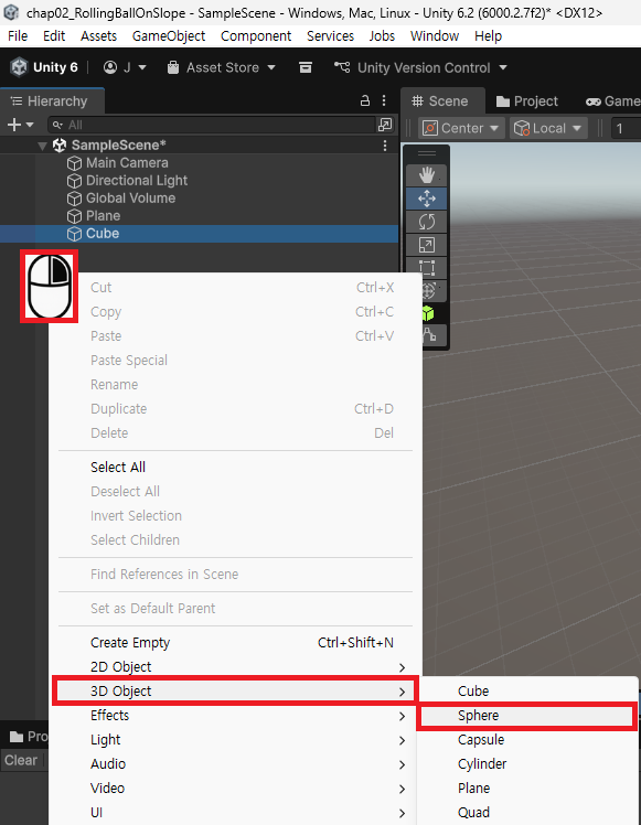 ⑤ "Hierarchy 창" → "마우스 우클릭 팝업메뉴" → "3D Object" → "Sphere"를 생성하여 공을 만든다.