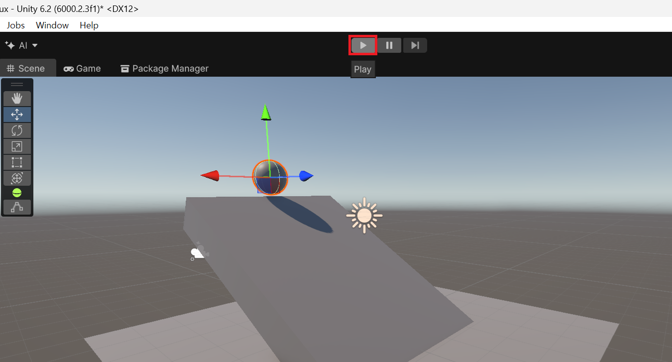 · Play 버튼으로 실행하여 공이 중력에 따라 경사로를 굴러 내려가는지 확인한다.