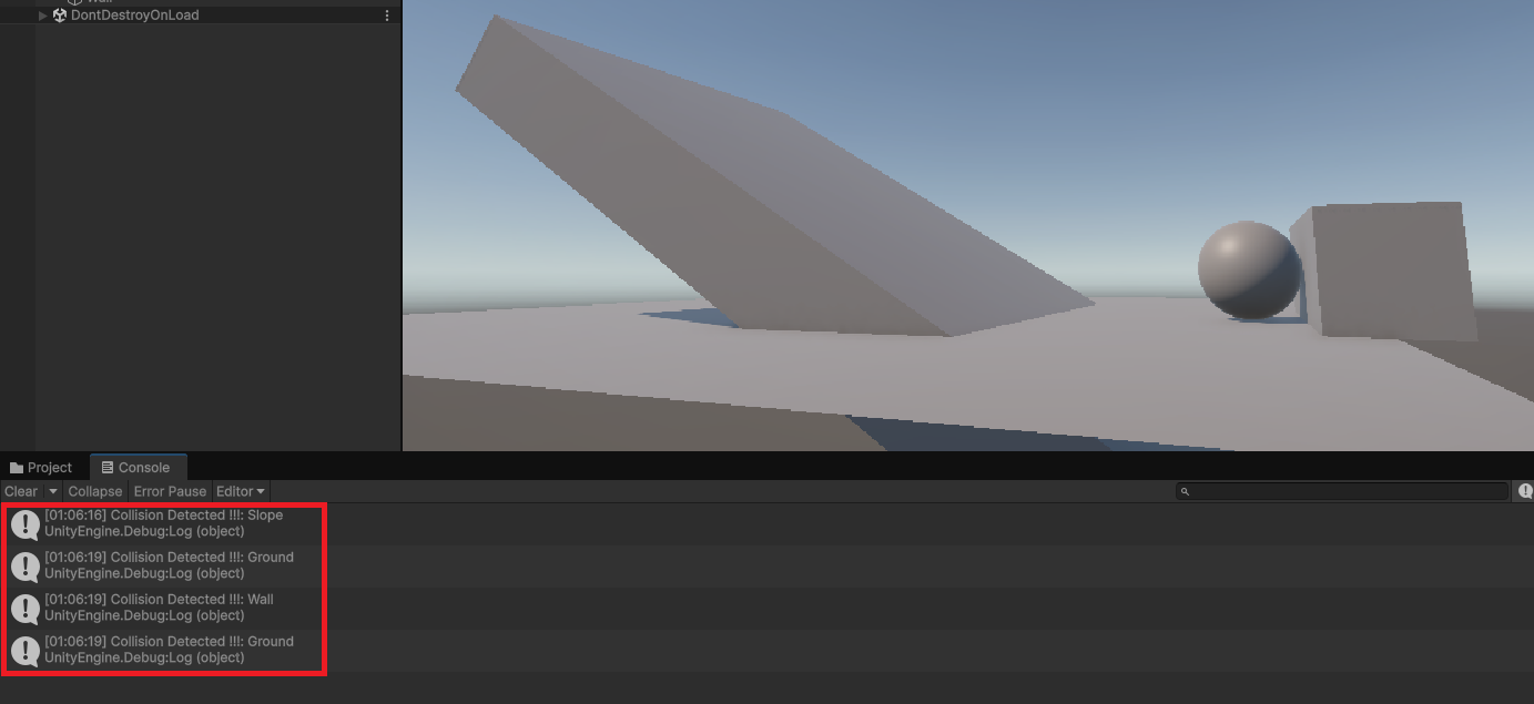 · 플레이 버튼으로 실행하면 공이 굴러 떨어지면서 충돌이 감지되는 대상 객체의 이름이 Log 출력된다.