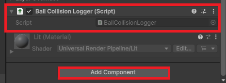 ⑧ Ball 객체 → "Add Component" 클릭 → BallCollisionLogger 파일 임포트 한다.