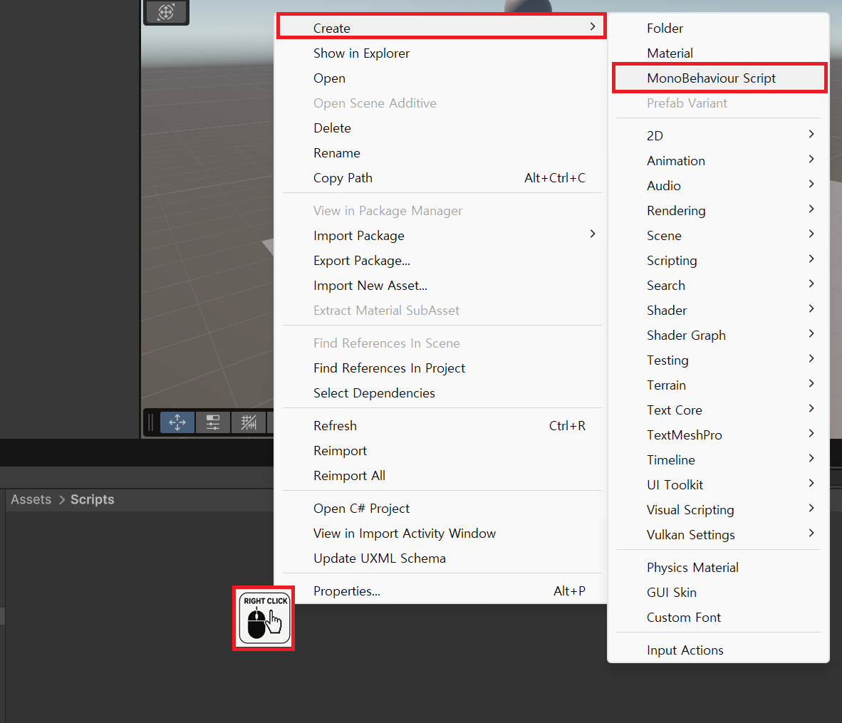 ⑥ "Project 창" → "마우스 우클릭 팝업 메뉴" → "Create" → "MonoBehavior Script" 파일을 생성한다.