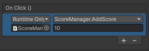 ⑨ AddScoreButton 객체의 OnClick() 시, ScoreManager의 AddScore()를 호출하도록 설정한다.