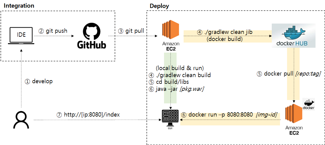 ˙ GitHub, Docker Hub, AWS EC2를 활용하여 Integration 및 Deploy 구축한다.