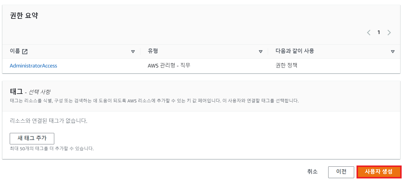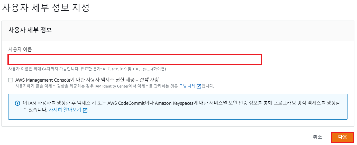 ⑦ AWS CLI 접근권한을 갖기 위한 사용자를 생성한다.