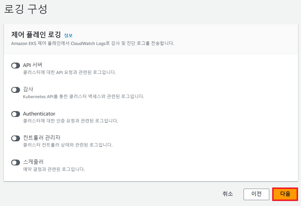 - ControlPlane의 로그를 CloudWatch로 전송 설정