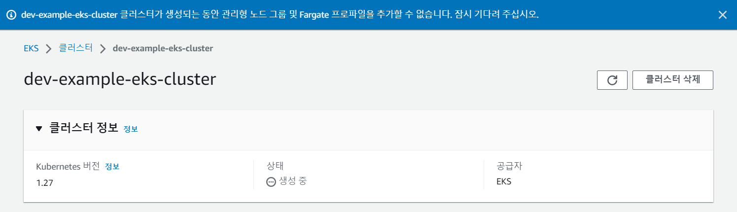 ⑩ EKS Cluster 생성을 완료하려면 10분 이상 소요된다.